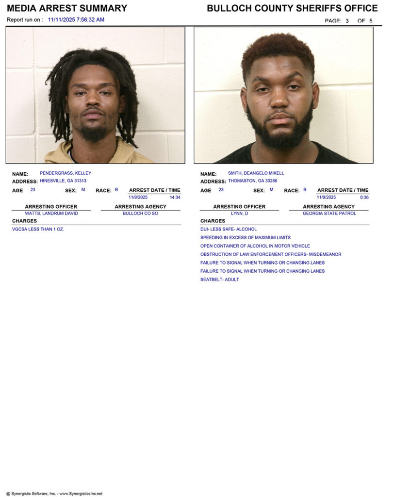These records are matters of public information provided by the Bulloch County Sheriff’s Office. Booking reports are details of arrests only. All persons below are considered to be innocent unless proven otherwise in a court of law.