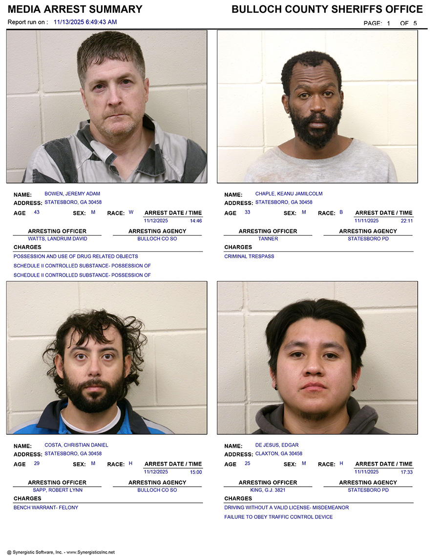 These records are matters of public information provided by the Bulloch County Sheriff’s Office. Booking reports are details of arrests only. All persons below are considered to be innocent unless proven otherwise in a court of law.