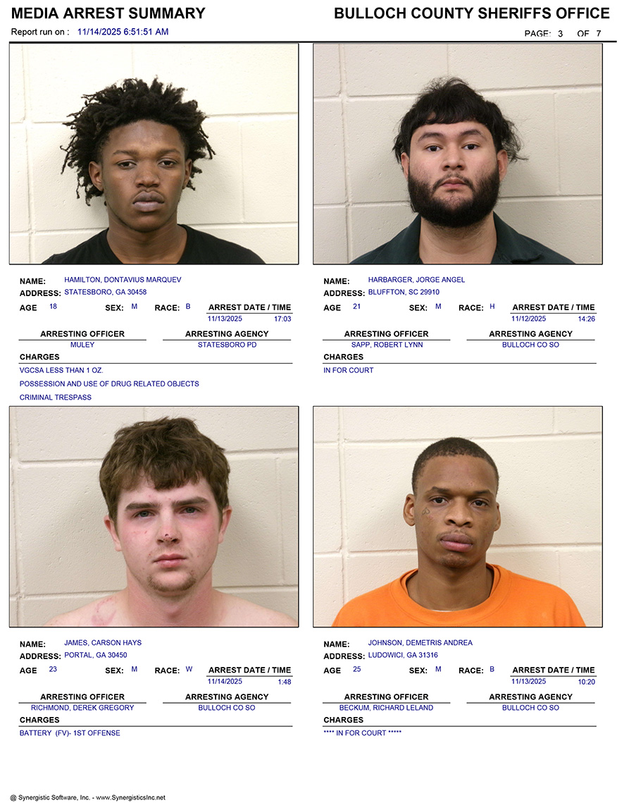 These records are matters of public information provided by the Bulloch County Sheriff’s Office. Booking reports are details of arrests only. All persons below are considered to be innocent unless proven otherwise in a court of law.