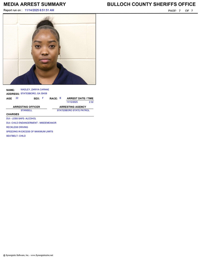 These records are matters of public information provided by the Bulloch County Sheriff’s Office. Booking reports are details of arrests only. All persons below are considered to be innocent unless proven otherwise in a court of law.