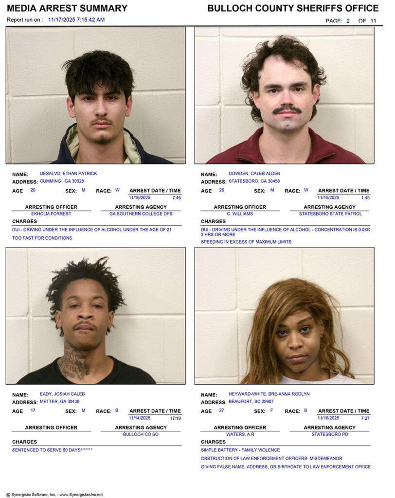 These records are matters of public information provided by the Bulloch County Sheriff’s Office. Booking reports are details of arrests only. All persons below are considered to be innocent unless proven otherwise in a court of law.