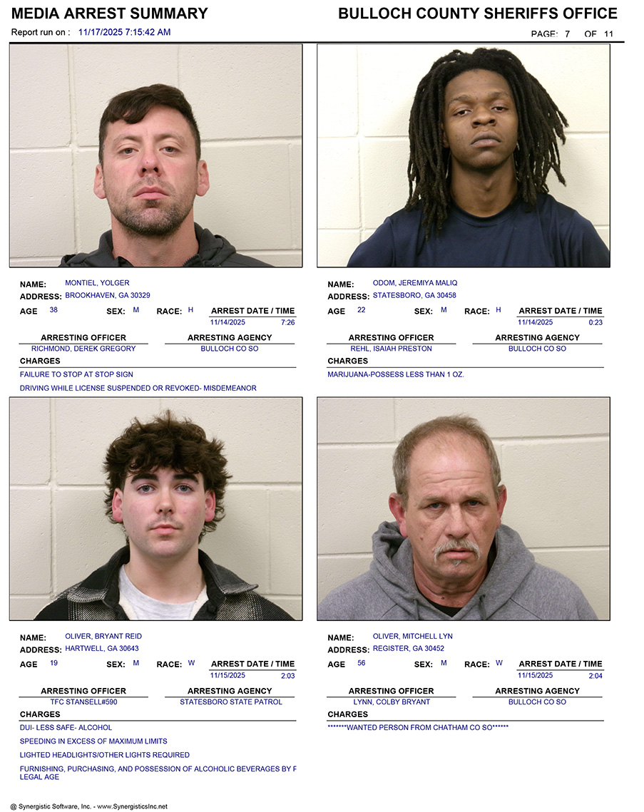 These records are matters of public information provided by the Bulloch County Sheriff’s Office. Booking reports are details of arrests only. All persons below are considered to be innocent unless proven otherwise in a court of law.
