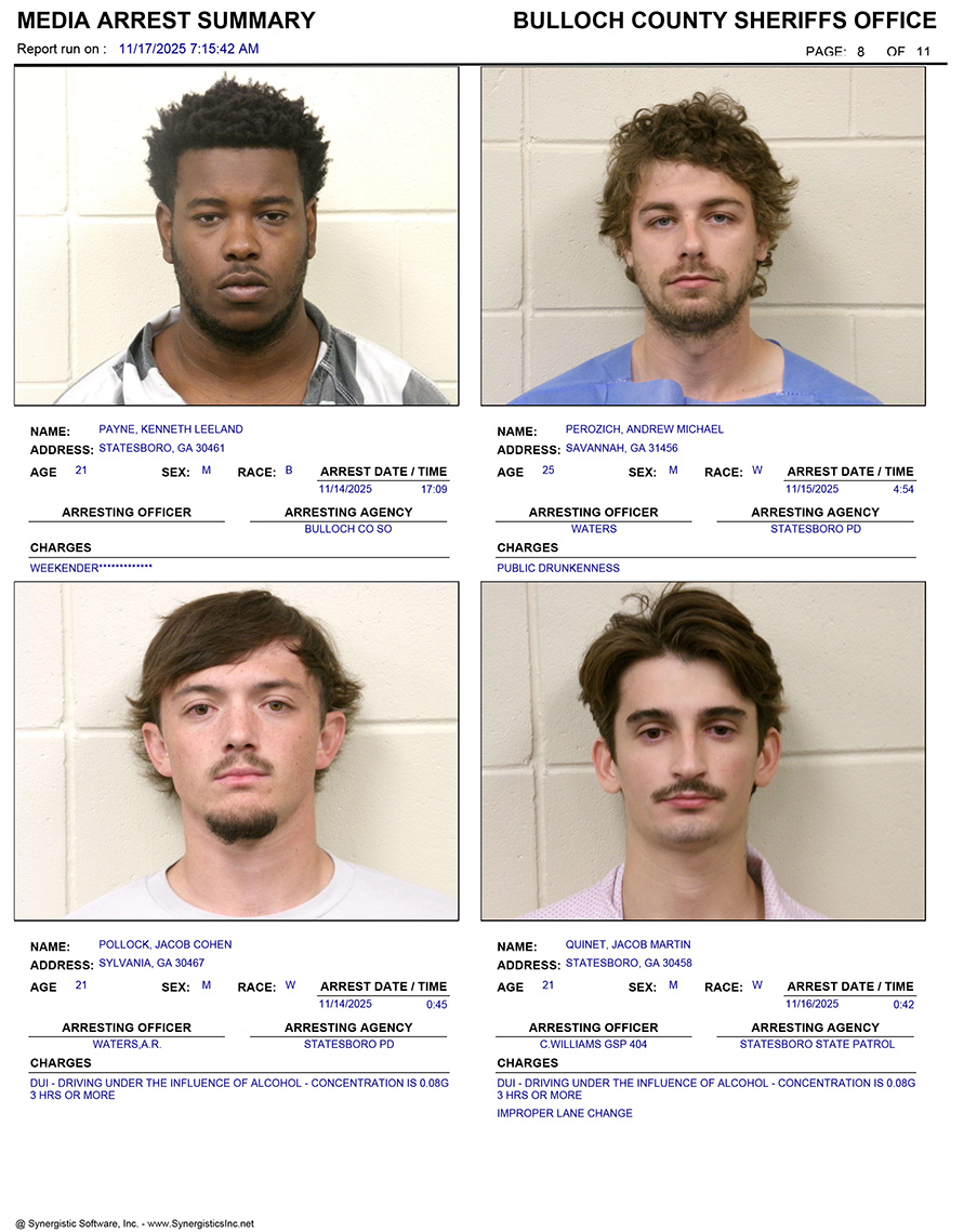 These records are matters of public information provided by the Bulloch County Sheriff’s Office. Booking reports are details of arrests only. All persons below are considered to be innocent unless proven otherwise in a court of law.