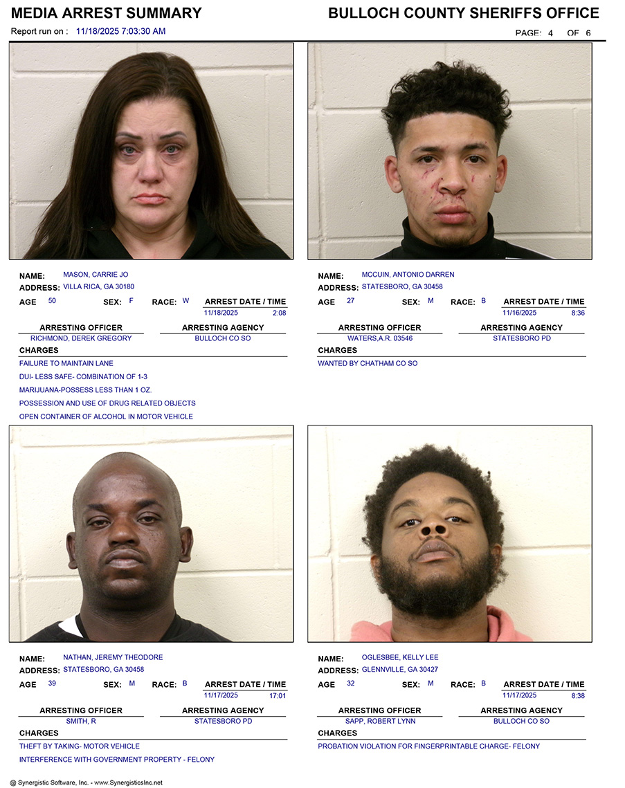 These records are matters of public information provided by the Bulloch County Sheriff’s Office. Booking reports are details of arrests only. All persons below are considered to be innocent unless proven otherwise in a court of law.
