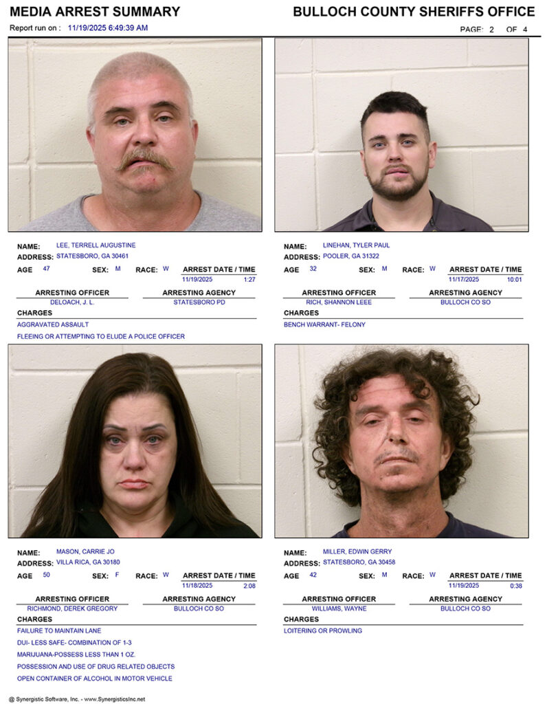 These records are matters of public information provided by the Bulloch County Sheriff’s Office. Booking reports are details of arrests only. All persons below are considered to be innocent unless proven otherwise in a court of law.