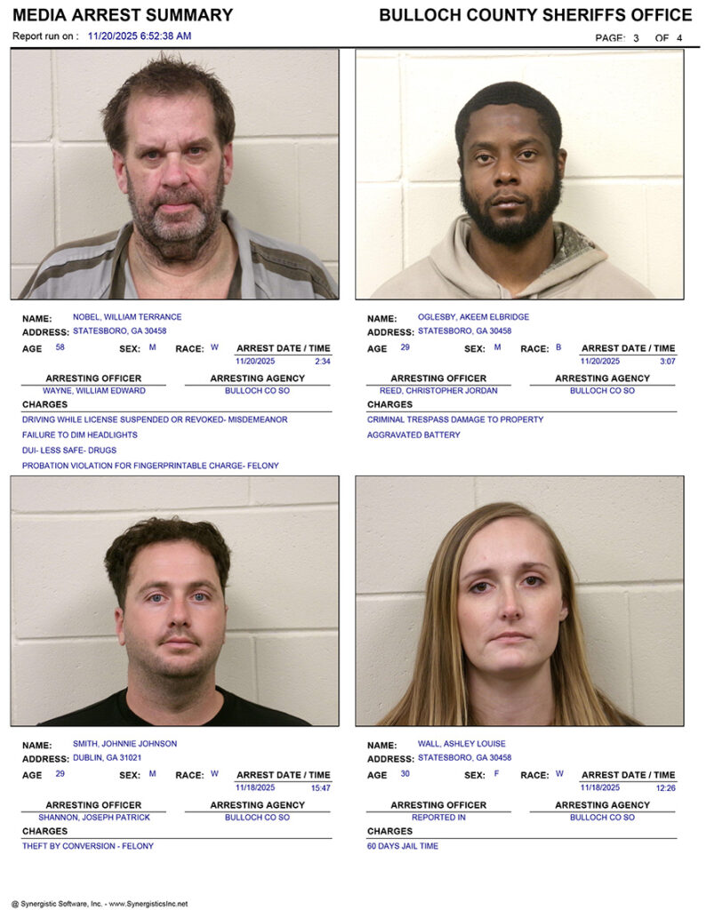 These records are matters of public information provided by the Bulloch County Sheriff’s Office. Booking reports are details of arrests only. All persons below are considered to be innocent unless proven otherwise in a court of law.