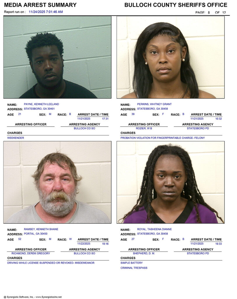 These records are matters of public information provided by the Bulloch County Sheriff’s Office. Booking reports are details of arrests only. All persons below are considered to be innocent unless proven otherwise in a court of law.