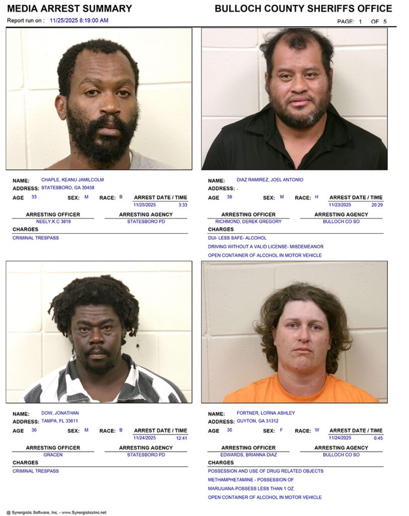 These records are matters of public information provided by the Bulloch County Sheriff’s Office. Booking reports are details of arrests only. All persons below are considered to be innocent unless proven otherwise in a court of law.