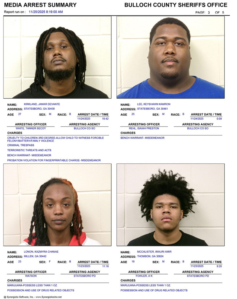 These records are matters of public information provided by the Bulloch County Sheriff’s Office. Booking reports are details of arrests only. All persons below are considered to be innocent unless proven otherwise in a court of law.