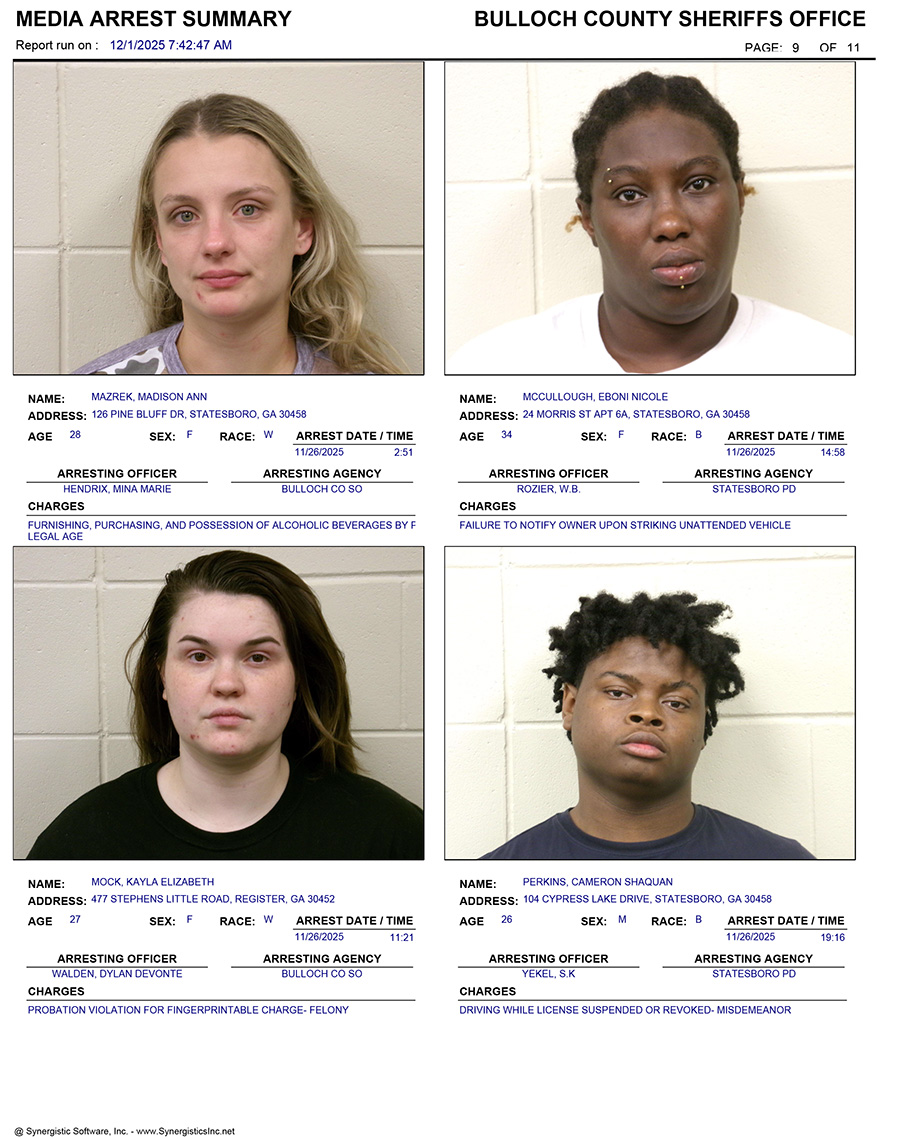 These records are matters of public information provided by the Bulloch County Sheriff’s Office. Booking reports are details of arrests only. All persons below are considered to be innocent unless proven otherwise in a court of law.