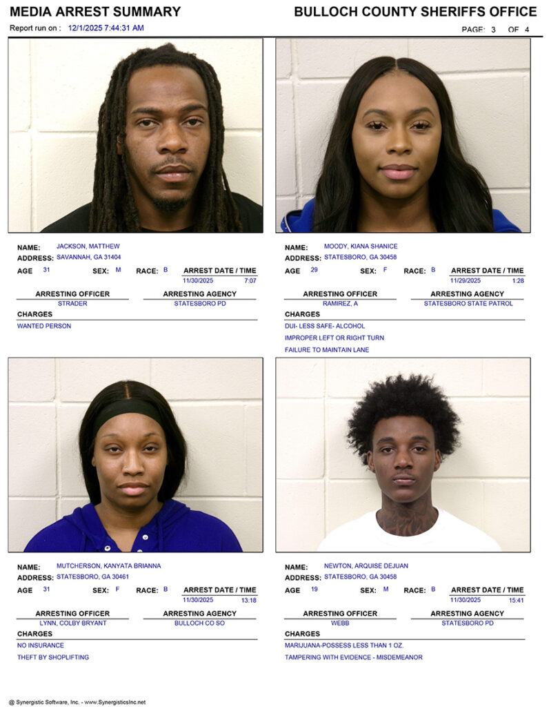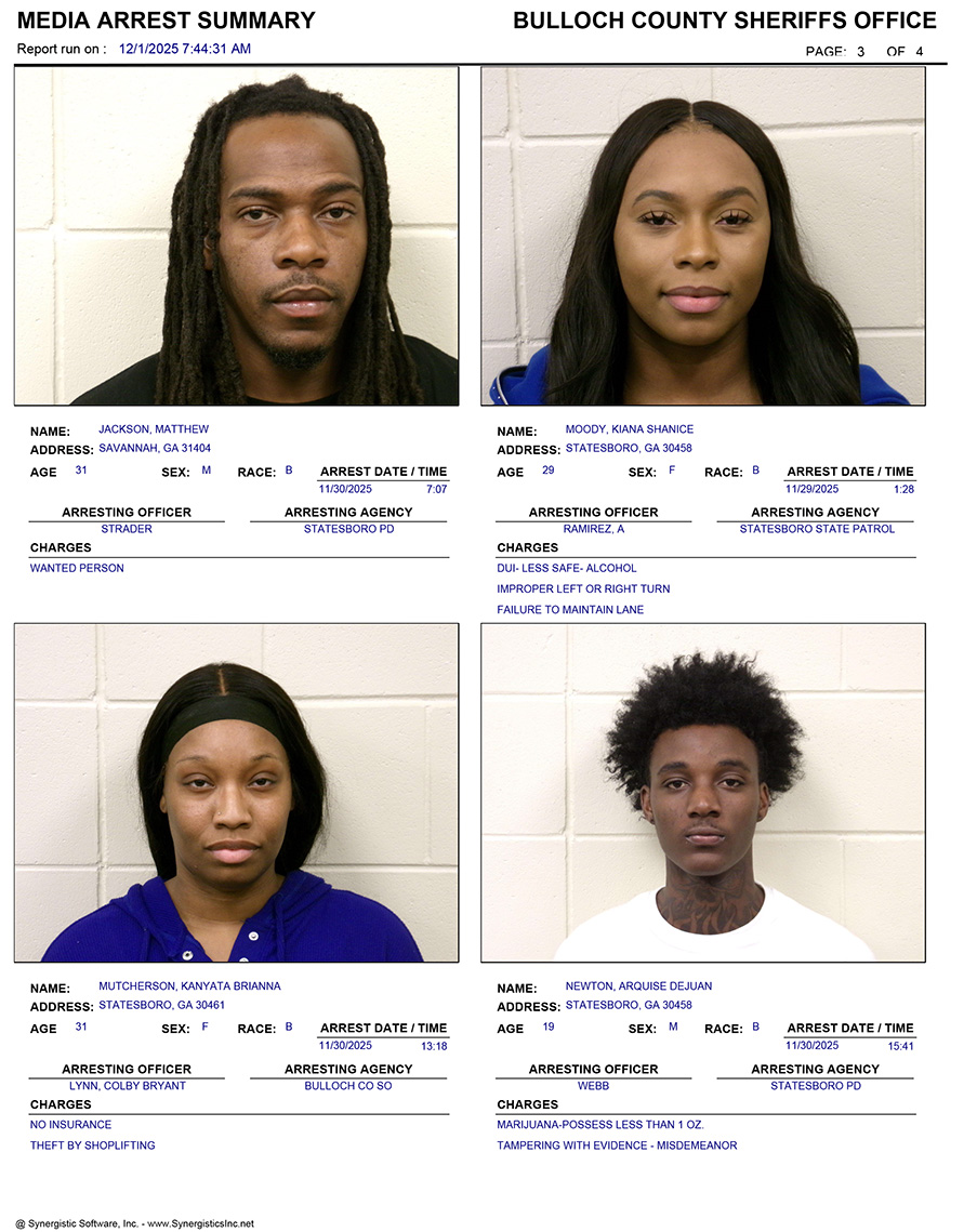 These records are matters of public information provided by the Bulloch County Sheriff’s Office. Booking reports are details of arrests only. All persons below are considered to be innocent unless proven otherwise in a court of law.