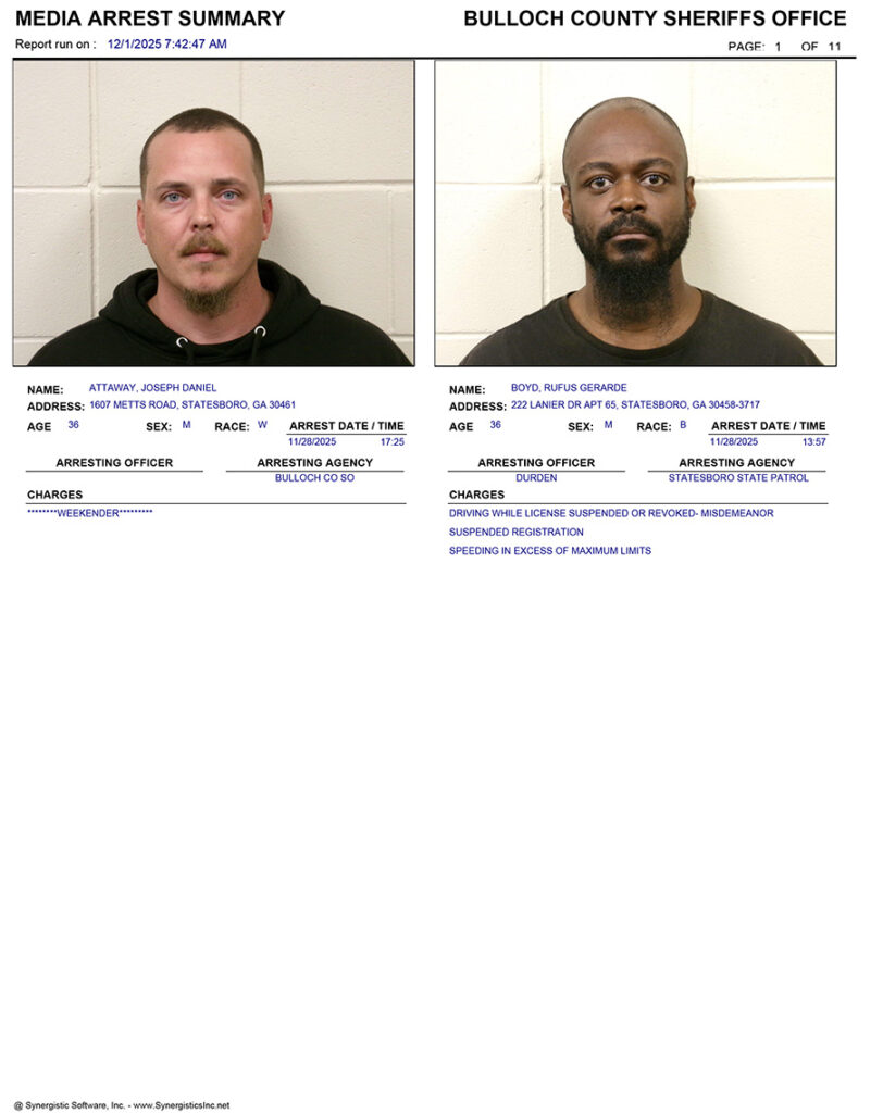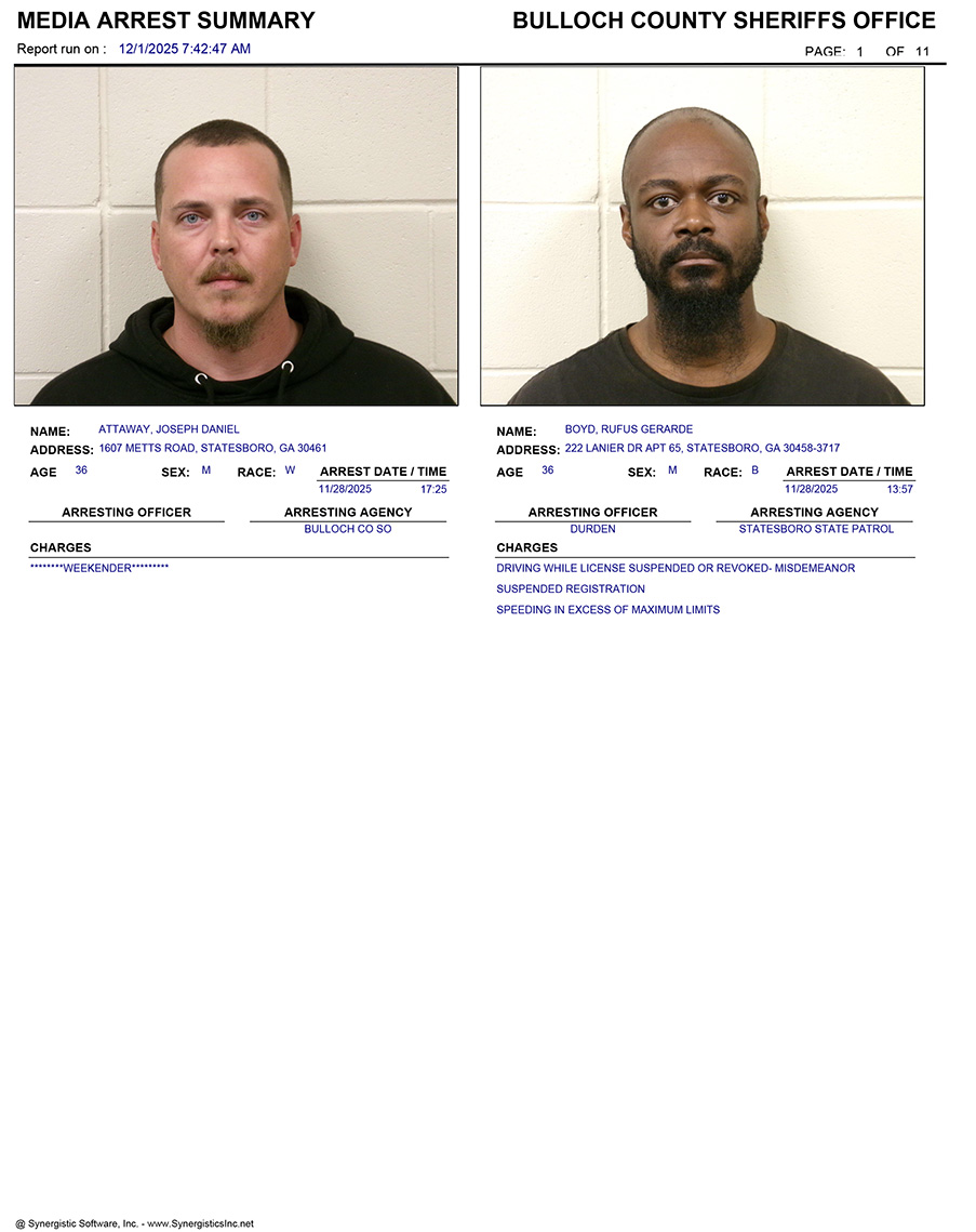 These records are matters of public information provided by the Bulloch County Sheriff’s Office. Booking reports are details of arrests only. All persons below are considered to be innocent unless proven otherwise in a court of law.