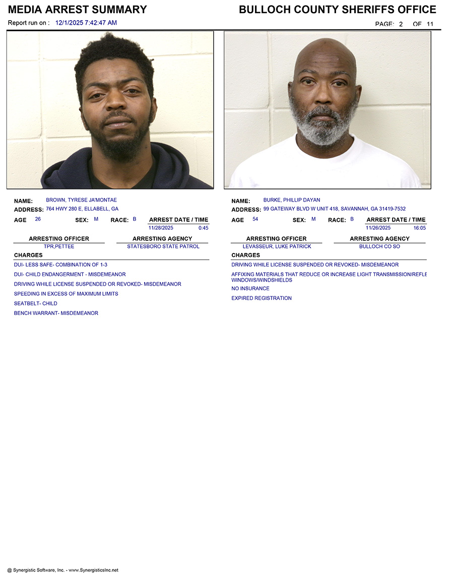 These records are matters of public information provided by the Bulloch County Sheriff’s Office. Booking reports are details of arrests only. All persons below are considered to be innocent unless proven otherwise in a court of law.