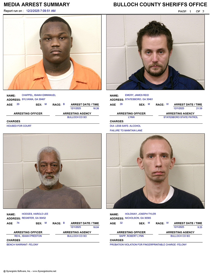 These records are matters of public information provided by the Bulloch County Sheriff’s Office. Booking reports are details of arrests only. All persons below are considered to be innocent unless proven otherwise in a court of law.