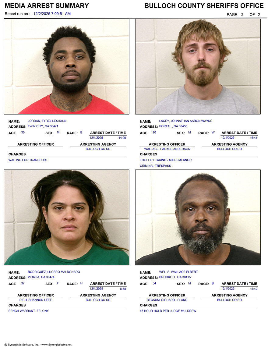These records are matters of public information provided by the Bulloch County Sheriff’s Office. Booking reports are details of arrests only. All persons below are considered to be innocent unless proven otherwise in a court of law.