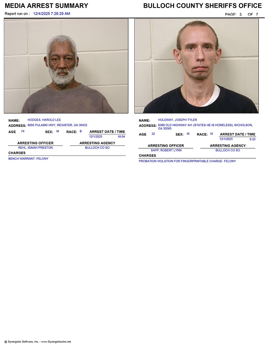 These records are matters of public information provided by the Bulloch County Sheriff’s Office. Booking reports are details of arrests only. All persons below are considered to be innocent unless proven otherwise in a court of law.