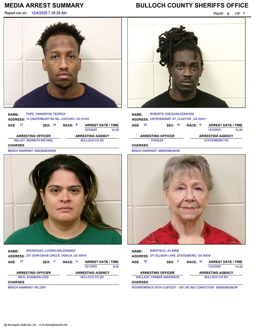 These records are matters of public information provided by the Bulloch County Sheriff’s Office. Booking reports are details of arrests only. All persons below are considered to be innocent unless proven otherwise in a court of law.