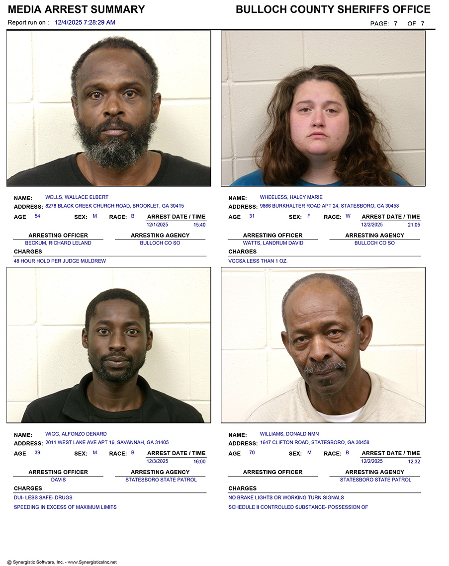 These records are matters of public information provided by the Bulloch County Sheriff’s Office. Booking reports are details of arrests only. All persons below are considered to be innocent unless proven otherwise in a court of law.