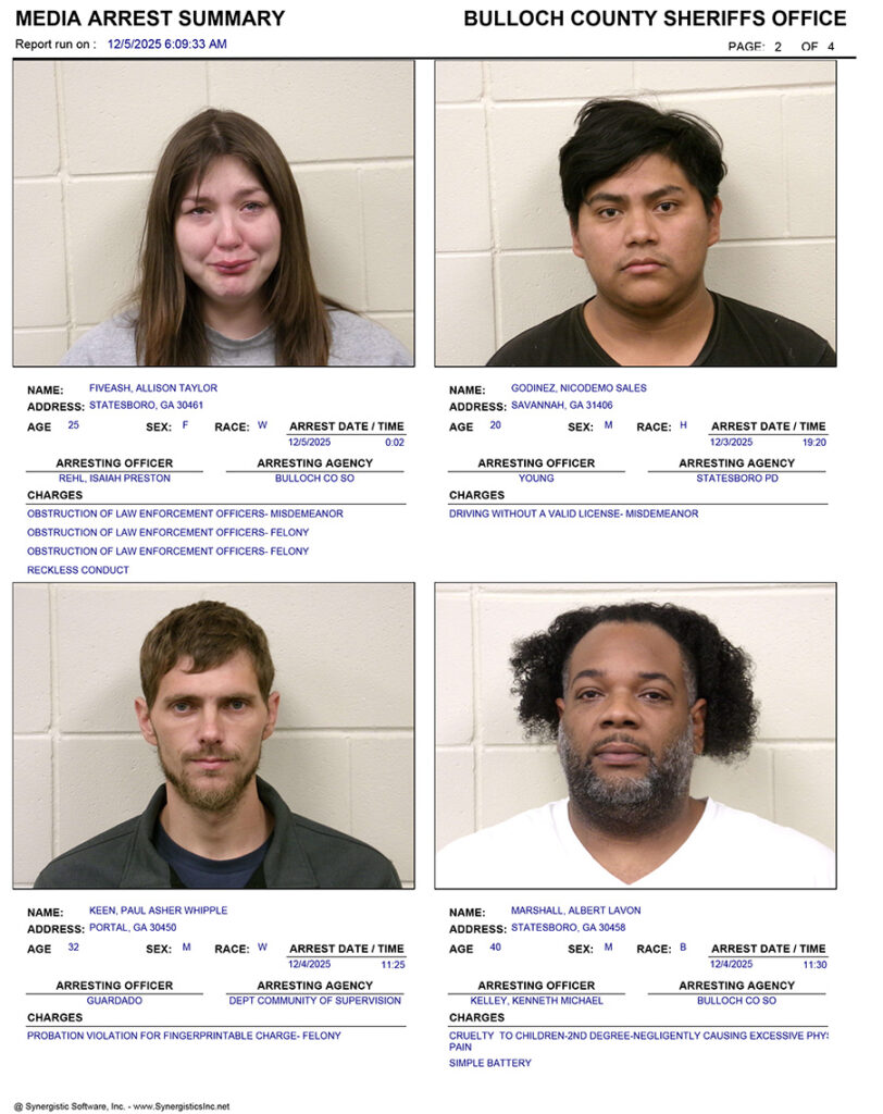 These records are matters of public information provided by the Bulloch County Sheriff’s Office. Booking reports are details of arrests only. All persons below are considered to be innocent unless proven otherwise in a court of law.