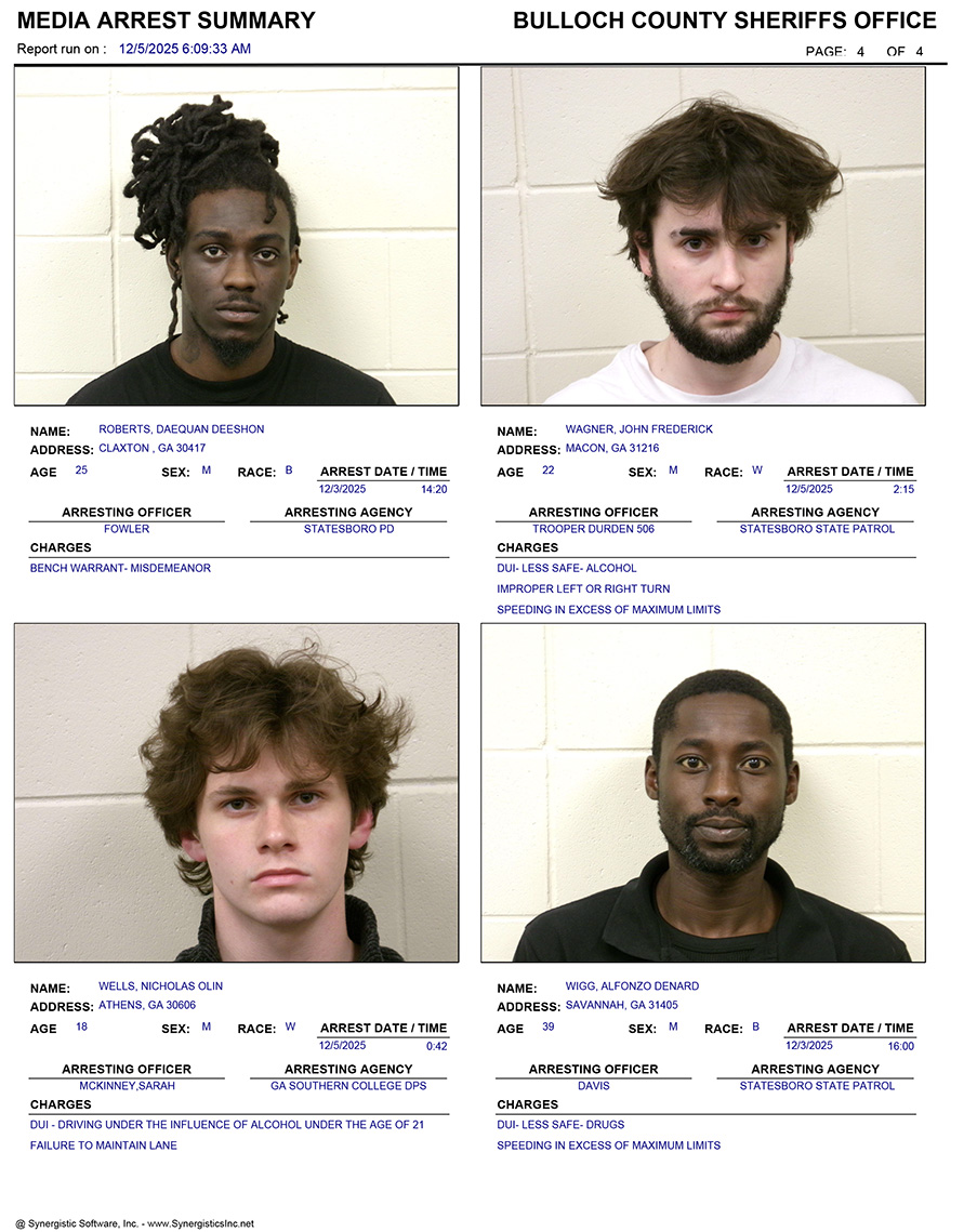 These records are matters of public information provided by the Bulloch County Sheriff’s Office. Booking reports are details of arrests only. All persons below are considered to be innocent unless proven otherwise in a court of law.