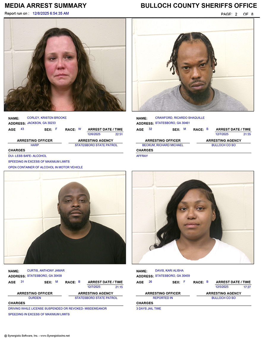These records are matters of public information provided by the Bulloch County Sheriff’s Office. Booking reports are details of arrests only. All persons below are considered to be innocent unless proven otherwise in a court of law.