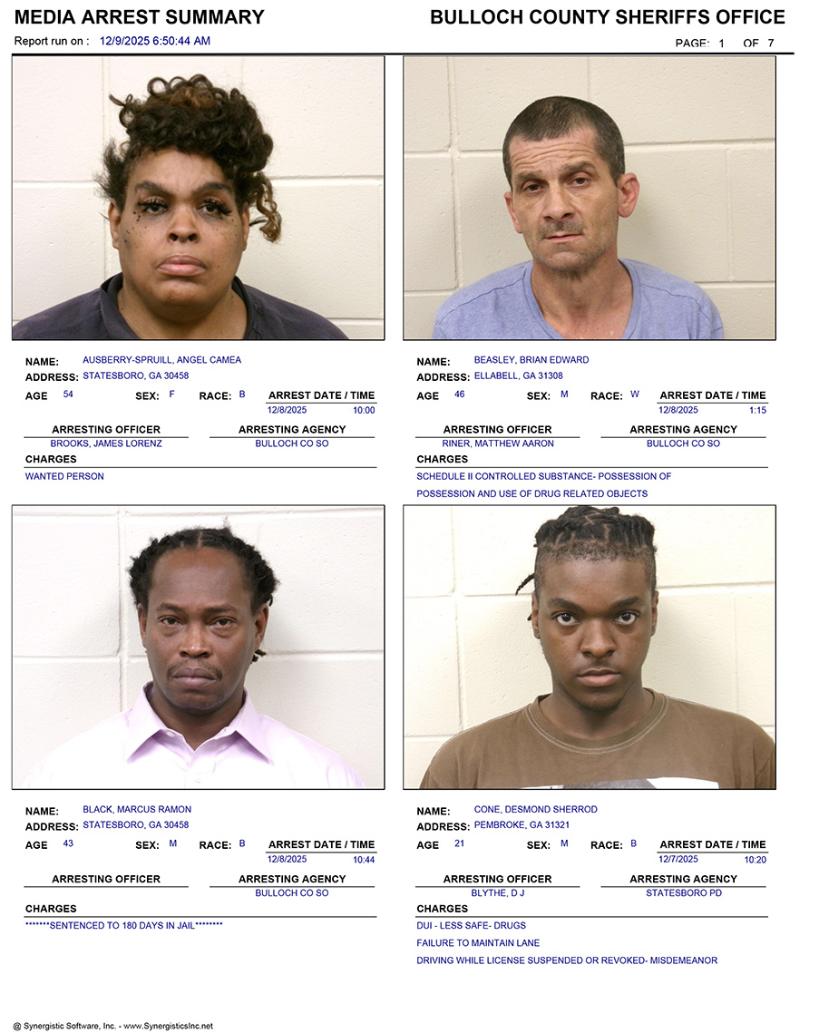 These records are matters of public information provided by the Bulloch County Sheriff’s Office. Booking reports are details of arrests only. All persons below are considered to be innocent unless proven otherwise in a court of law.