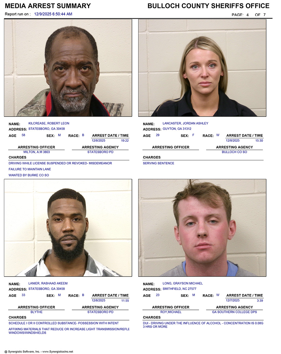 These records are matters of public information provided by the Bulloch County Sheriff’s Office. Booking reports are details of arrests only. All persons below are considered to be innocent unless proven otherwise in a court of law.