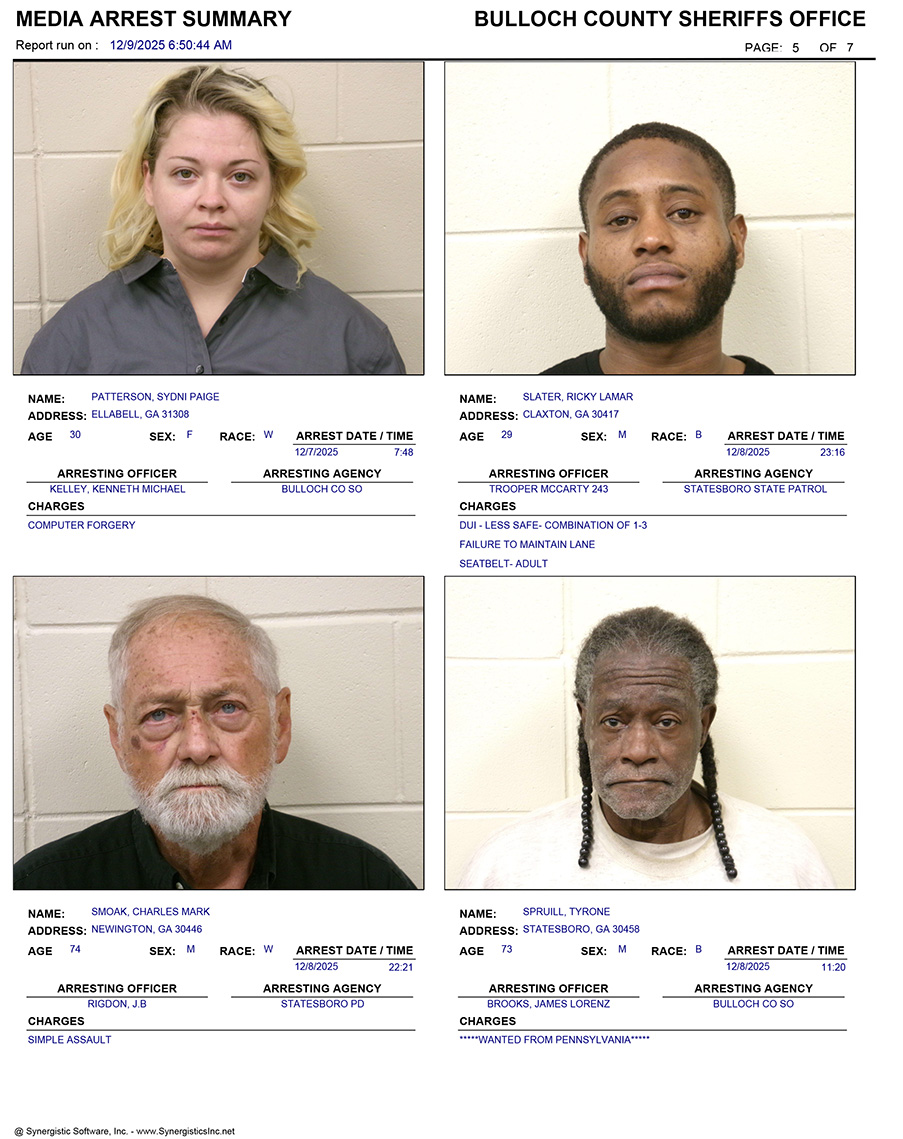 These records are matters of public information provided by the Bulloch County Sheriff’s Office. Booking reports are details of arrests only. All persons below are considered to be innocent unless proven otherwise in a court of law.