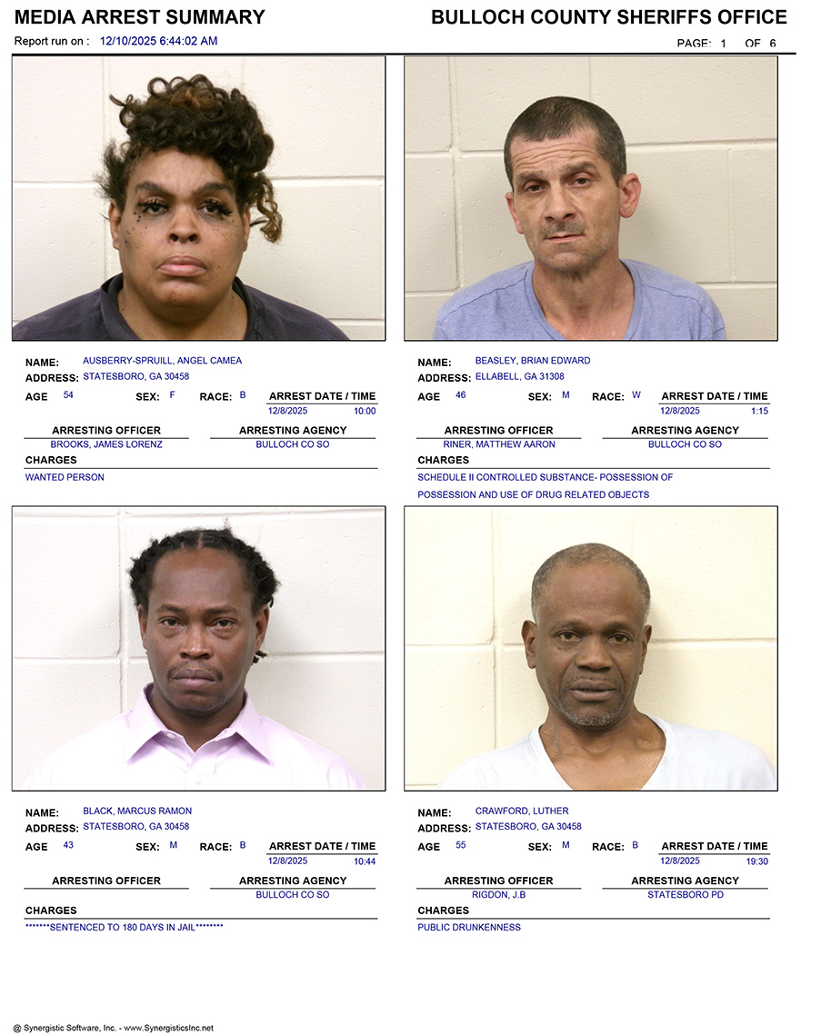 These records are matters of public information provided by the Bulloch County Sheriff’s Office. Booking reports are details of arrests only. All persons below are considered to be innocent unless proven otherwise in a court of law.