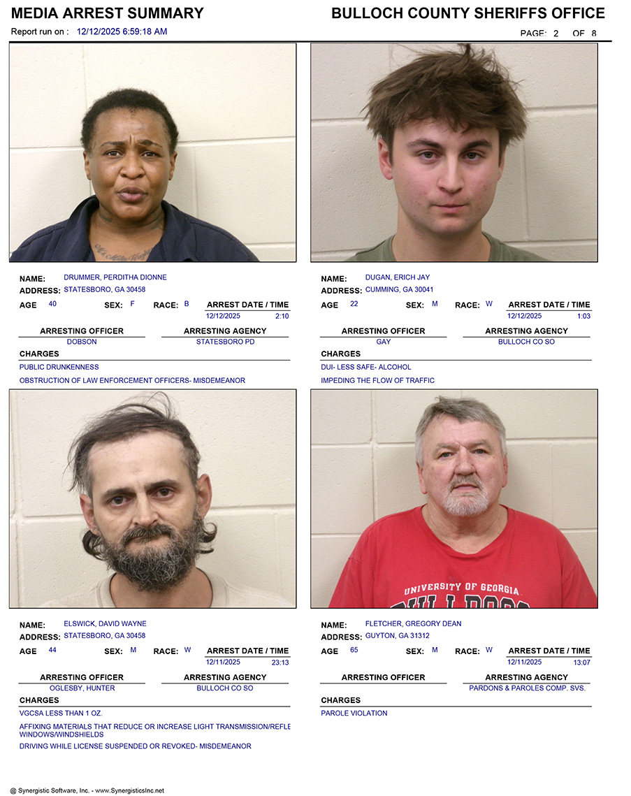 These records are matters of public information provided by the Bulloch County Sheriff’s Office. Booking reports are details of arrests only. All persons below are considered to be innocent unless proven otherwise in a court of law.