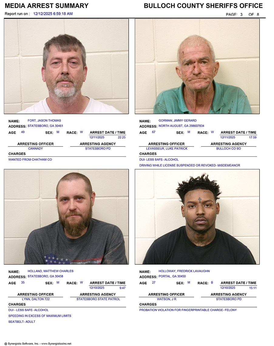 These records are matters of public information provided by the Bulloch County Sheriff’s Office. Booking reports are details of arrests only. All persons below are considered to be innocent unless proven otherwise in a court of law.