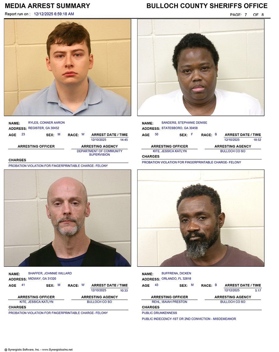 These records are matters of public information provided by the Bulloch County Sheriff’s Office. Booking reports are details of arrests only. All persons below are considered to be innocent unless proven otherwise in a court of law.