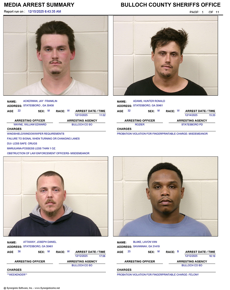 These records are matters of public information provided by the Bulloch County Sheriff’s Office. Booking reports are details of arrests only. All persons below are considered to be innocent unless proven otherwise in a court of law.