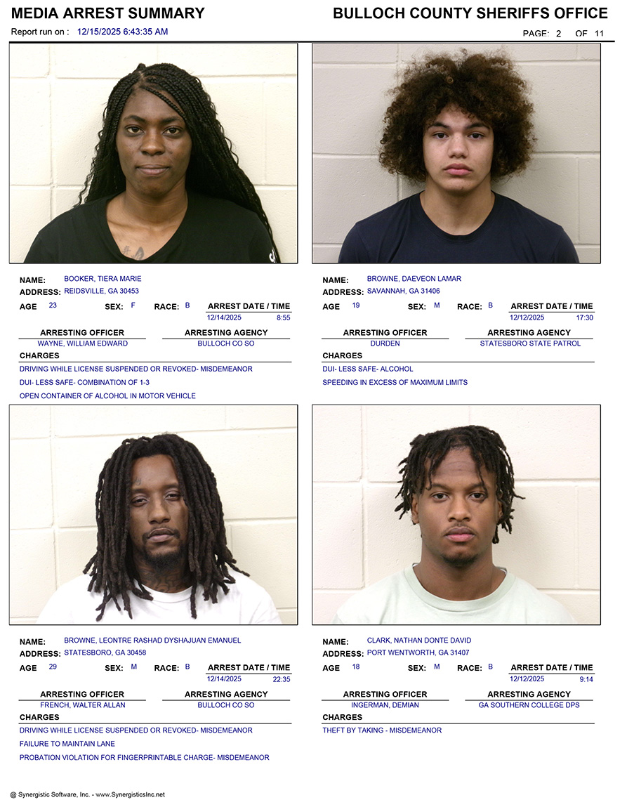These records are matters of public information provided by the Bulloch County Sheriff’s Office. Booking reports are details of arrests only. All persons below are considered to be innocent unless proven otherwise in a court of law.