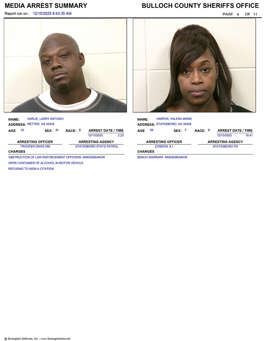 These records are matters of public information provided by the Bulloch County Sheriff’s Office. Booking reports are details of arrests only. All persons below are considered to be innocent unless proven otherwise in a court of law.