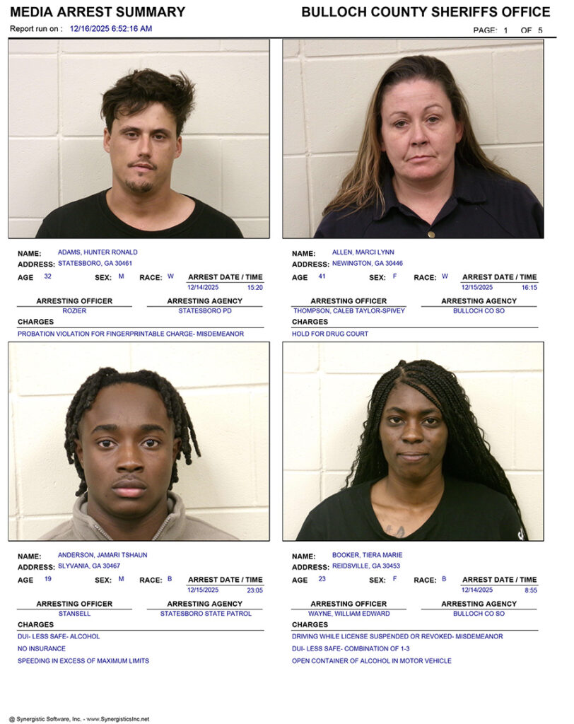 These records are matters of public information provided by the Bulloch County Sheriff’s Office. Booking reports are details of arrests only. All persons below are considered to be innocent unless proven otherwise in a court of law.