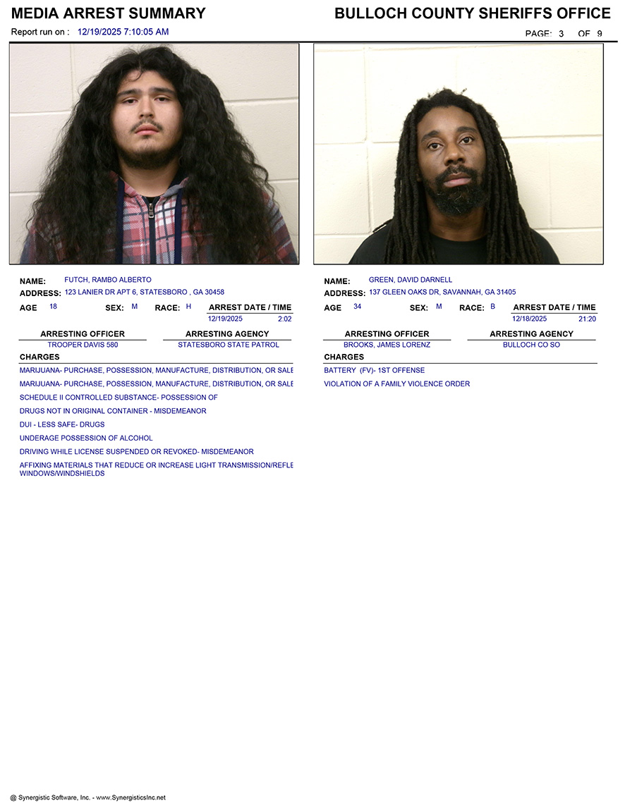 These records are matters of public information provided by the Bulloch County Sheriff’s Office. Booking reports are details of arrests only. All persons below are considered to be innocent unless proven otherwise in a court of law.