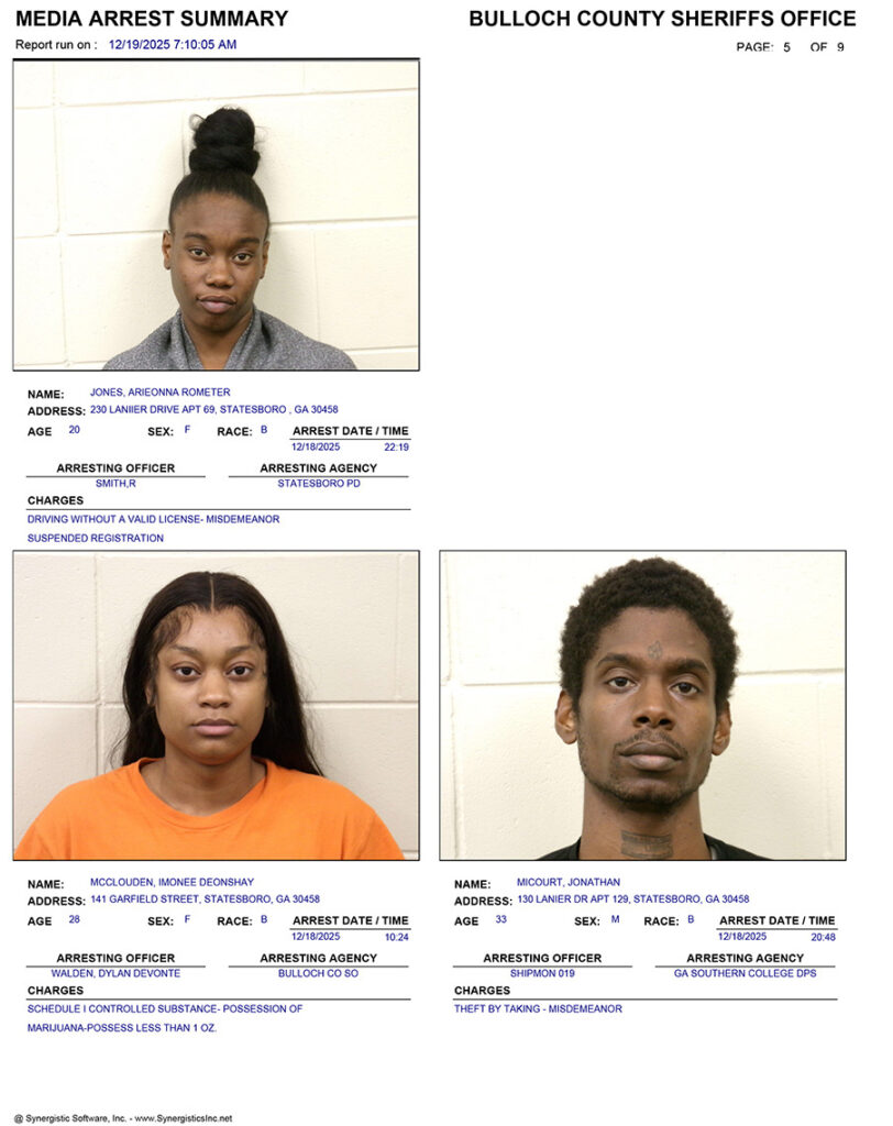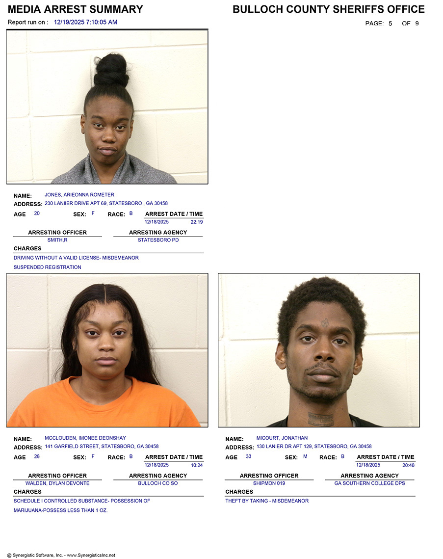These records are matters of public information provided by the Bulloch County Sheriff’s Office. Booking reports are details of arrests only. All persons below are considered to be innocent unless proven otherwise in a court of law.
