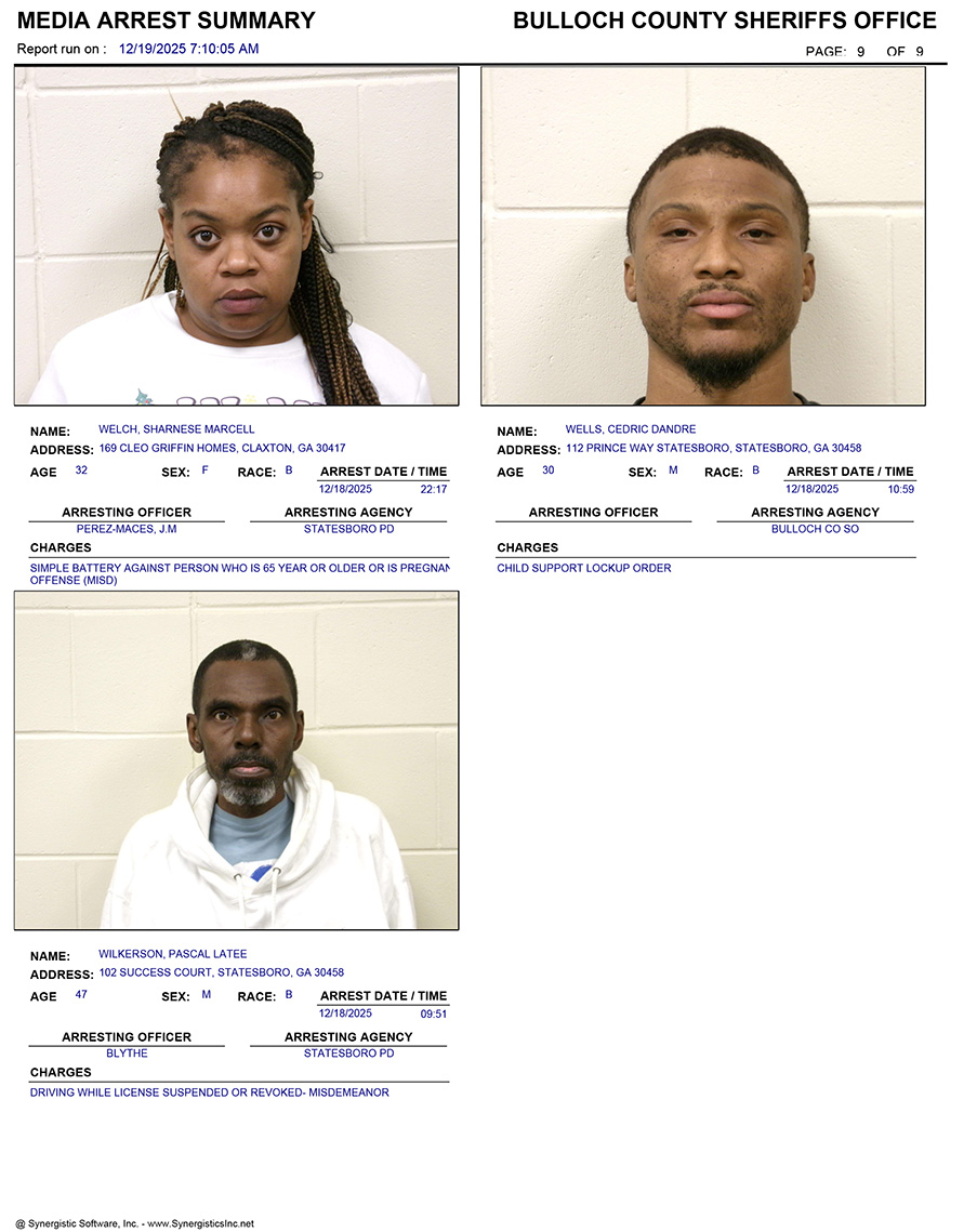 These records are matters of public information provided by the Bulloch County Sheriff’s Office. Booking reports are details of arrests only. All persons below are considered to be innocent unless proven otherwise in a court of law.