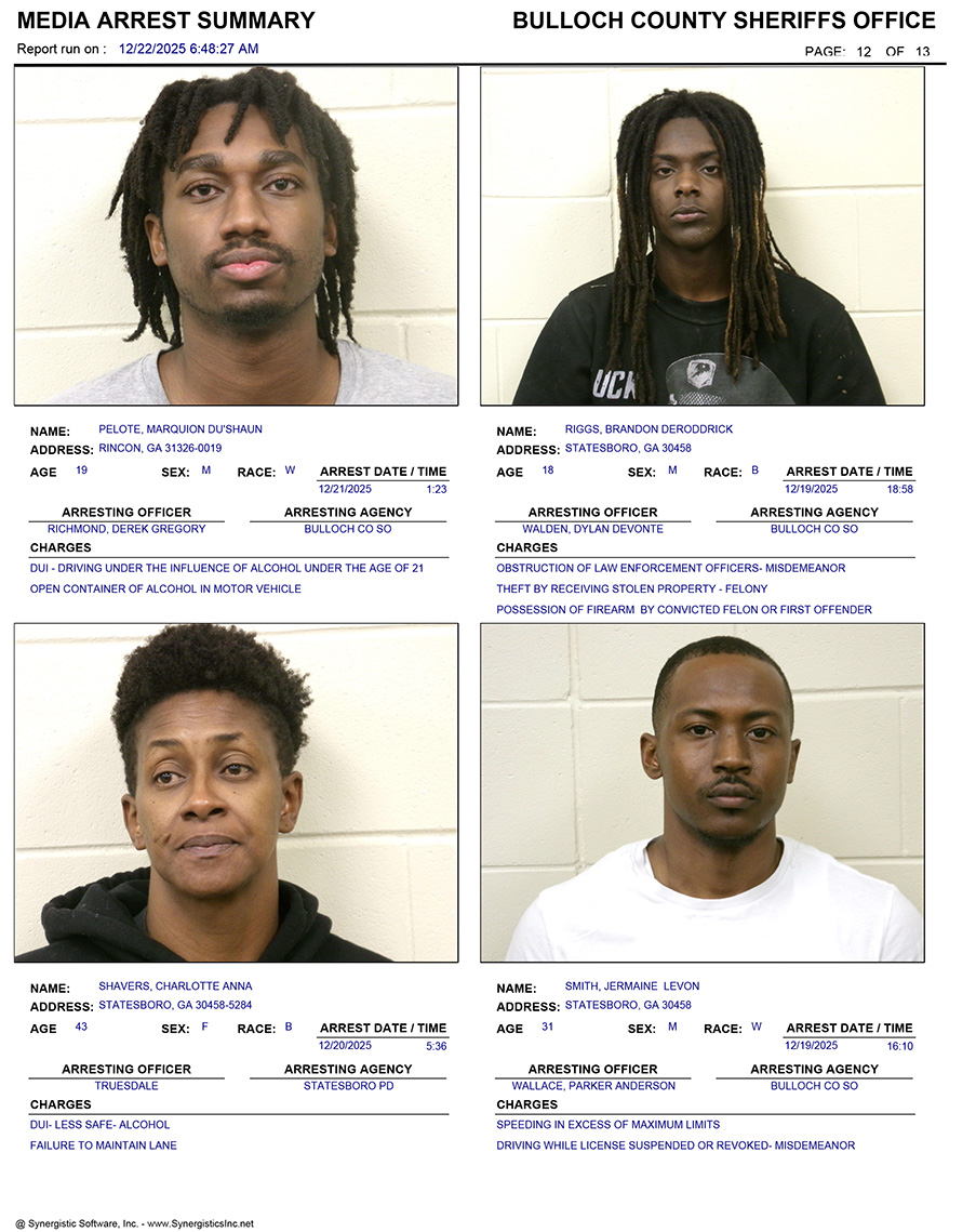 These records are matters of public information provided by the Bulloch County Sheriff’s Office. Booking reports are details of arrests only. All persons below are considered to be innocent unless proven otherwise in a court of law.