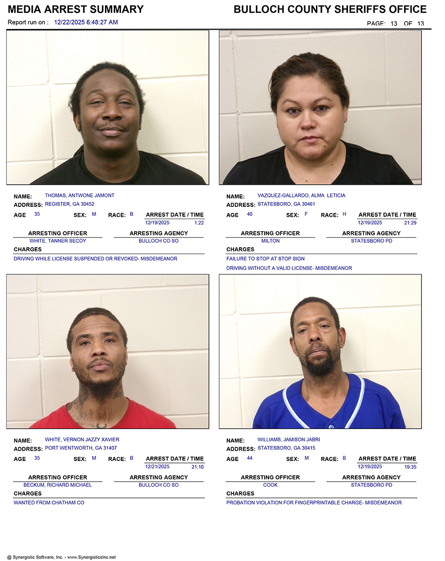 These records are matters of public information provided by the Bulloch County Sheriff’s Office. Booking reports are details of arrests only. All persons below are considered to be innocent unless proven otherwise in a court of law.