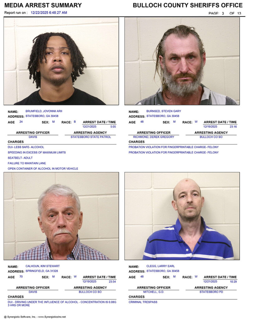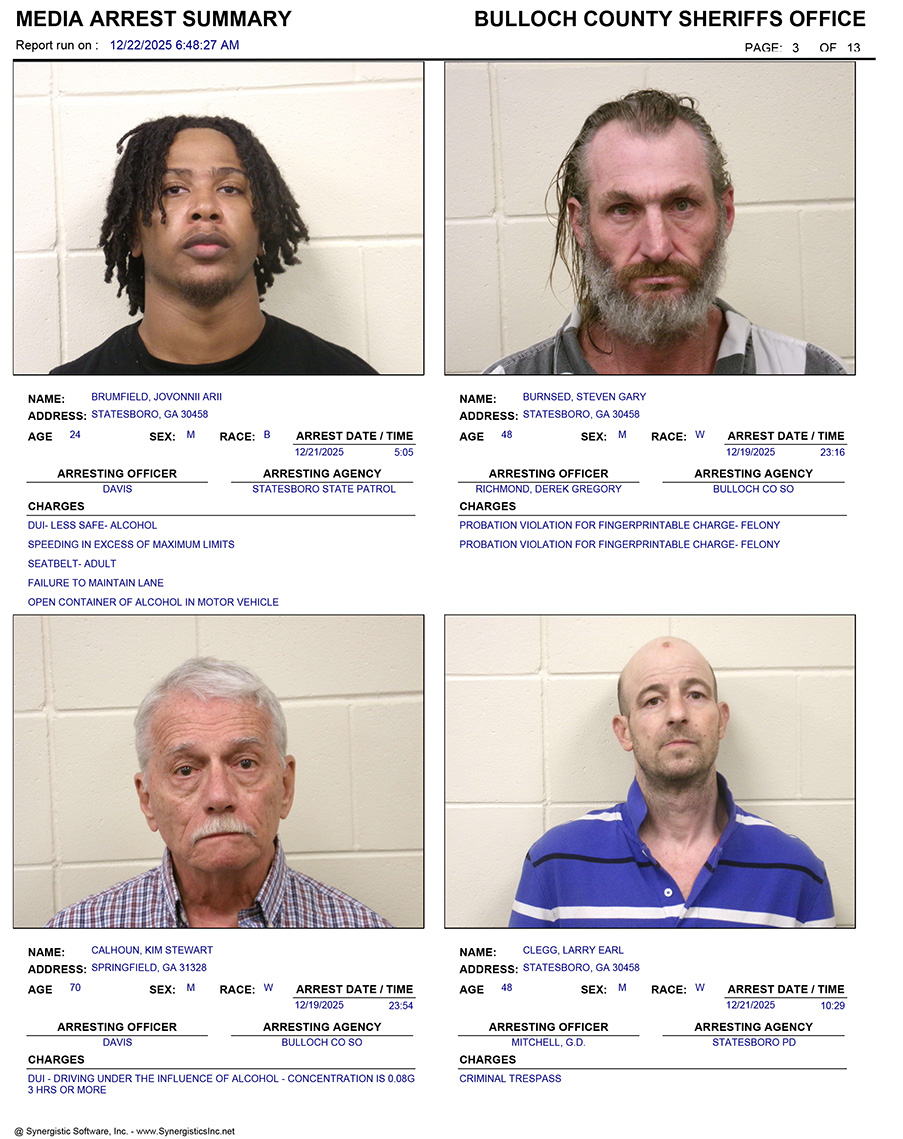 These records are matters of public information provided by the Bulloch County Sheriff’s Office. Booking reports are details of arrests only. All persons below are considered to be innocent unless proven otherwise in a court of law.