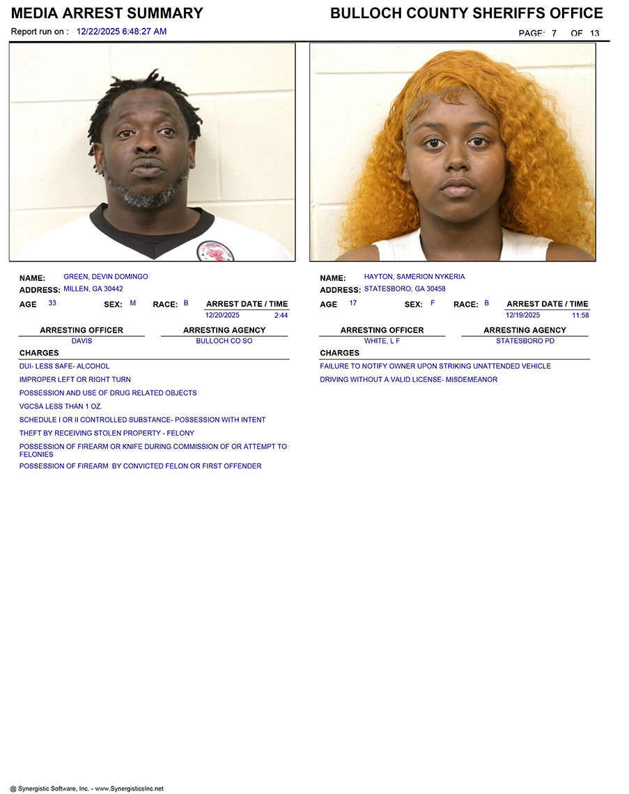 These records are matters of public information provided by the Bulloch County Sheriff’s Office. Booking reports are details of arrests only. All persons below are considered to be innocent unless proven otherwise in a court of law.