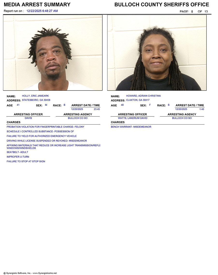These records are matters of public information provided by the Bulloch County Sheriff’s Office. Booking reports are details of arrests only. All persons below are considered to be innocent unless proven otherwise in a court of law.