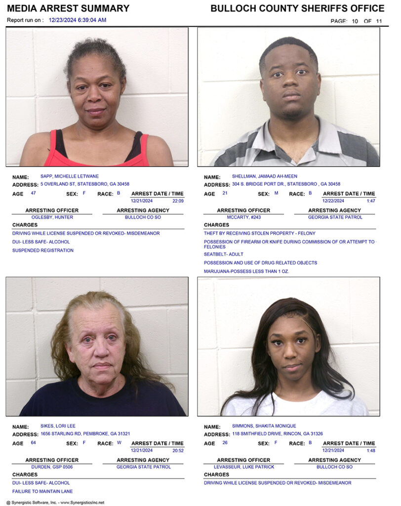 These records are matters of public information provided by the Bulloch County Sheriff’s Office. Booking reports are details of arrests only. All persons below are considered to be innocent unless proven otherwise in a court of law.
