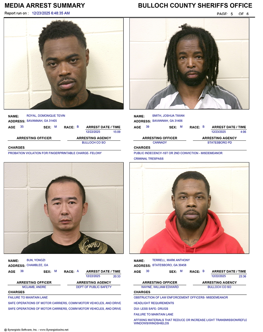 These records are matters of public information provided by the Bulloch County Sheriff’s Office. Booking reports are details of arrests only. All persons below are considered to be innocent unless proven otherwise in a court of law.