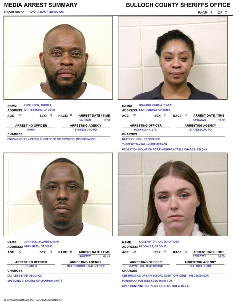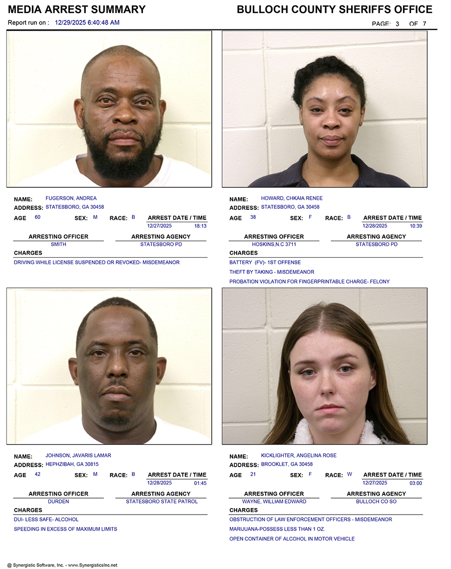 These records are matters of public information provided by the Bulloch County Sheriff’s Office. Booking reports are details of arrests only. All persons below are considered to be innocent unless proven otherwise in a court of law.