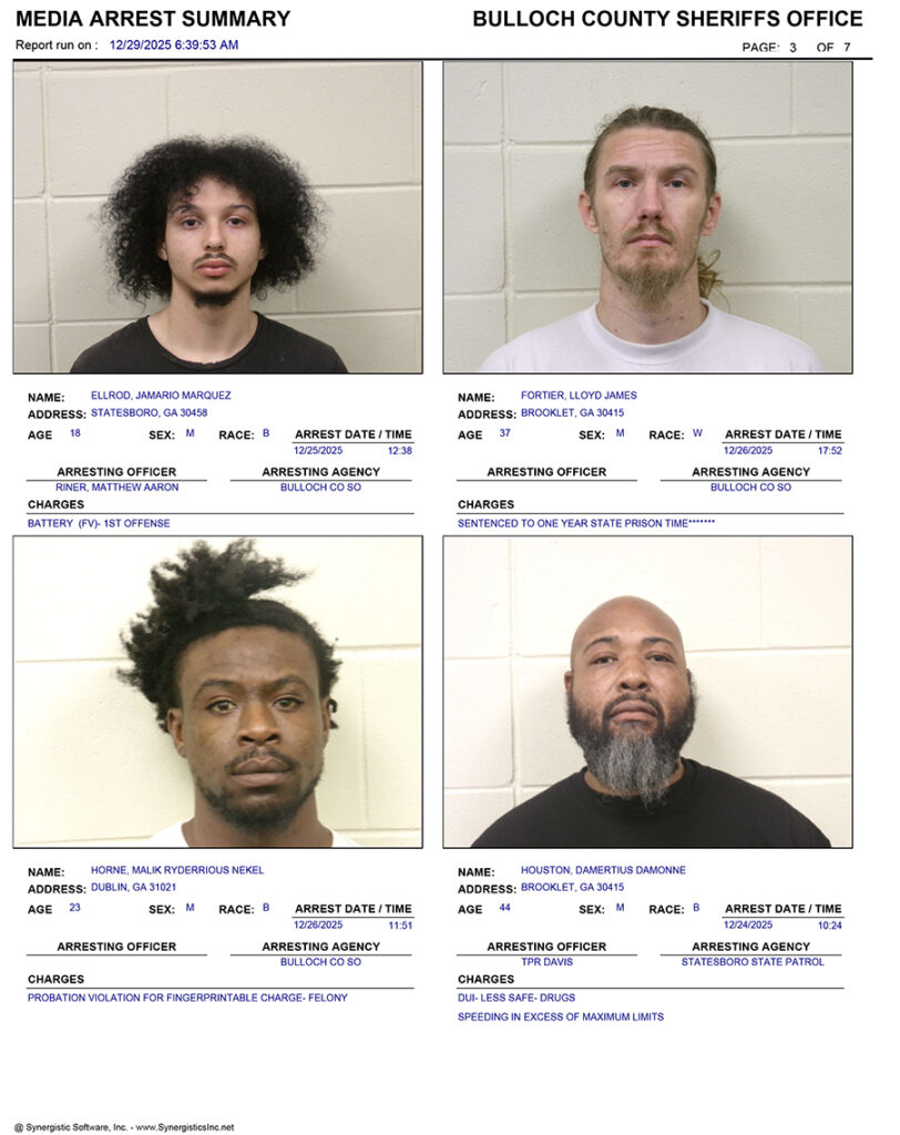 These records are matters of public information provided by the Bulloch County Sheriff’s Office. Booking reports are details of arrests only. All persons below are considered to be innocent unless proven otherwise in a court of law.