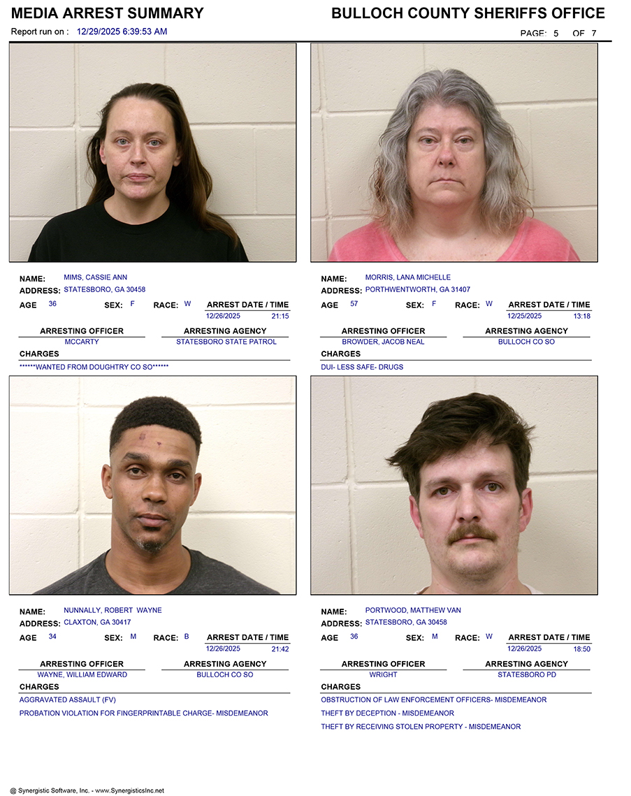 These records are matters of public information provided by the Bulloch County Sheriff’s Office. Booking reports are details of arrests only. All persons below are considered to be innocent unless proven otherwise in a court of law.