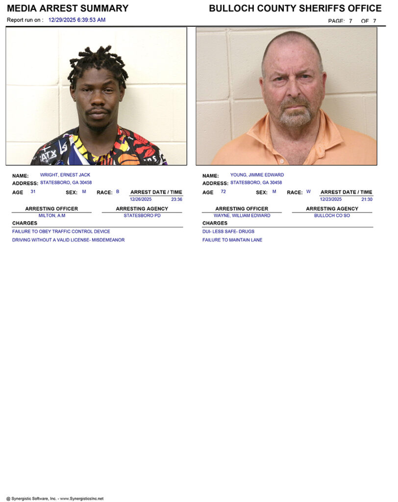 These records are matters of public information provided by the Bulloch County Sheriff’s Office. Booking reports are details of arrests only. All persons below are considered to be innocent unless proven otherwise in a court of law.